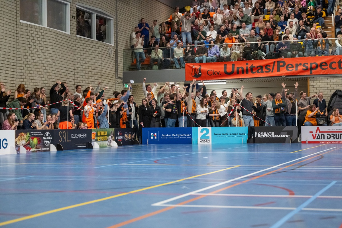 Een uitverkochte hal met 850 fans, vier gele kaarten en een oponthoud van 40 minuten. Er gebeurde van alles in en rond de intense derby op vrijdagavond tussen Unitas en DOS’46, waarbij de Harderwijkers het spel na rust naar hun hand zetten: 19-14.