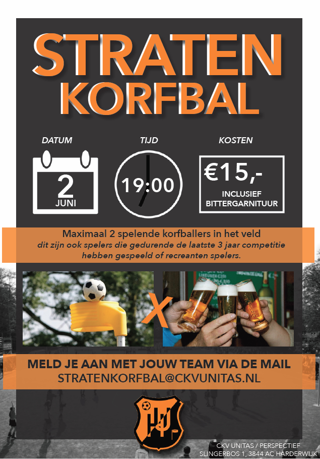Vrijdagavond 2 juni is het zover, CKV Unitas/Perspectief organiseert wederom het stratenkorfbal / bedrijventoernooi. Vanaf 19:15 uur zullen de eerste poulewedstrijden van start gaan. Welk team mag zich uiteindelijk kronen tot winnaar? Vorig jaar won onze hoofdsponsor Perspectief de titel. Er is plek voor 16 teams, geef je team snel op vóór 26 mei via stratenkorfbal@ckvunitas-perspectief.nl