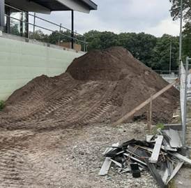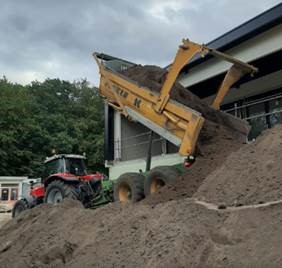Het eerste zand is aangebracht. Het is nu ten doel om erboven veilig te kunnen werken. Maar daarnaast kan het mooi inzinken. Dit zal tzt rond het hele gebouw worden aangebracht.