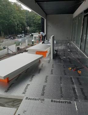 Er is een start gemaakt om het terras van isolatie en tegels te voorzien. Na deze klus kan verder worden gegaan met de gevel (A28 zijde) en het afwerken van de pui aan de voorkant.