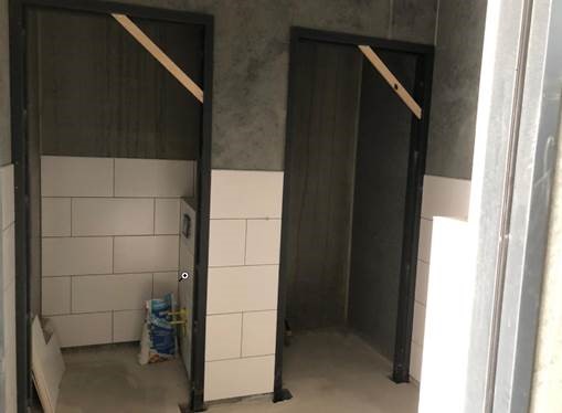 Een groot gedeelte van de douches zit er inmiddels in, er is een start gemaakt met de centrale wc’s.