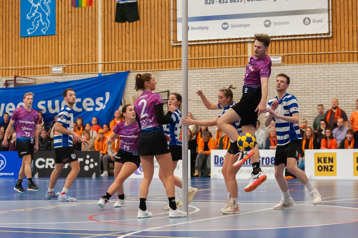 Blauw-Wit hield echter het initiatief. Via een schot en een strafworp liep de thuisploeg weer uit, waarna Mike van Boven met een kleine kans iets terugdeed. Moniek van Renselaar benutte vervolgens een strafworp voor 18-11. Ondanks deze momenten bleef het verschil aanzienlijk. In het laatste kwartier probeerde Unitas/Perspectief het duel alsnog te kantelen. Na een onderschepping van Femke Faber schoot Matté Lipke raak voor 18-12, maar Blauw-Wit bleef uiterst effectief en strafte vrijwel iedere fout genadeloos af.