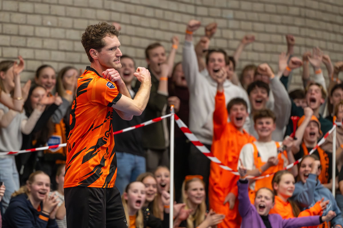 De 31-jarige Mark Kreikamp was echter de verrassing van de avond. Vorig jaar nam hij afscheid thuis tegen DOS’46. Nu was de speler uit het derde ineens weer nodig en schakelde alsof hij niet was weggeweest Jorne van der Zee uit én scoorde zelf nog twee keer. ,,Ik had gezegd dat ik fit ben en als ik nodig ben het altijd kan, maar ik wil geen mensen in de weg zitten. Het pakte waanzinnig uit, dat had ik niet verwacht. Bij de heren is Jorne de spits, het gevaar moest van hem komen. Dat ik zo lang mocht spelen kwam ook doordat onze aanval scoorde, dan hoef je niet te wisselen. Alles viel goed, beter kan niet.  Dat je het in zo’n volle hal mag doen is supergaaf en cool. Het was heel lang heel stroef, gelukkig kwamen we over het dode punt. Deze punten zijn wel heel belangrijk, ik denk niet dat het nu nog mis kan gaan.”